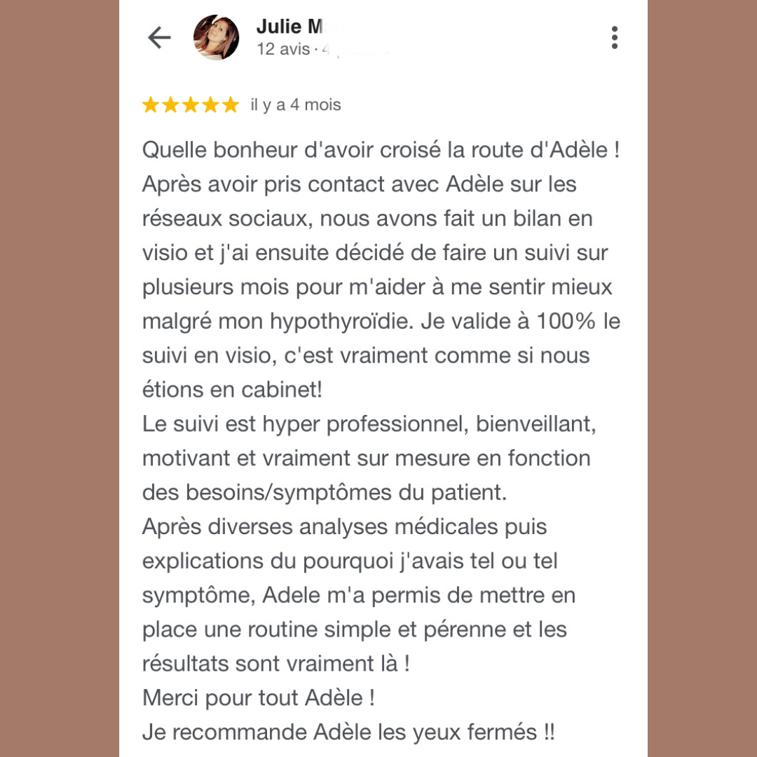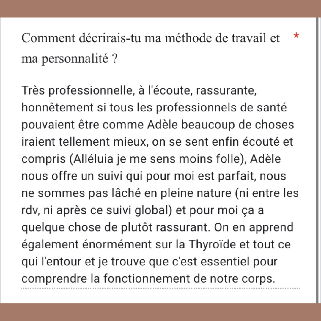 Mon côté infirmière prend le dessus : j'ai à coeur de t'éduquer à la santé. Pour cela on va enquêter pour comprendre la cause de tes déséquilibres, par le biais d'analyses biologiques fonctionnelles (=non médicales). Cela permettra d'objectiver les dysfonctionnements et de mettre en place un protocole adapté. Tu auras de l'informations et tu seras au clair sur ce qu'il se passe pour toi.