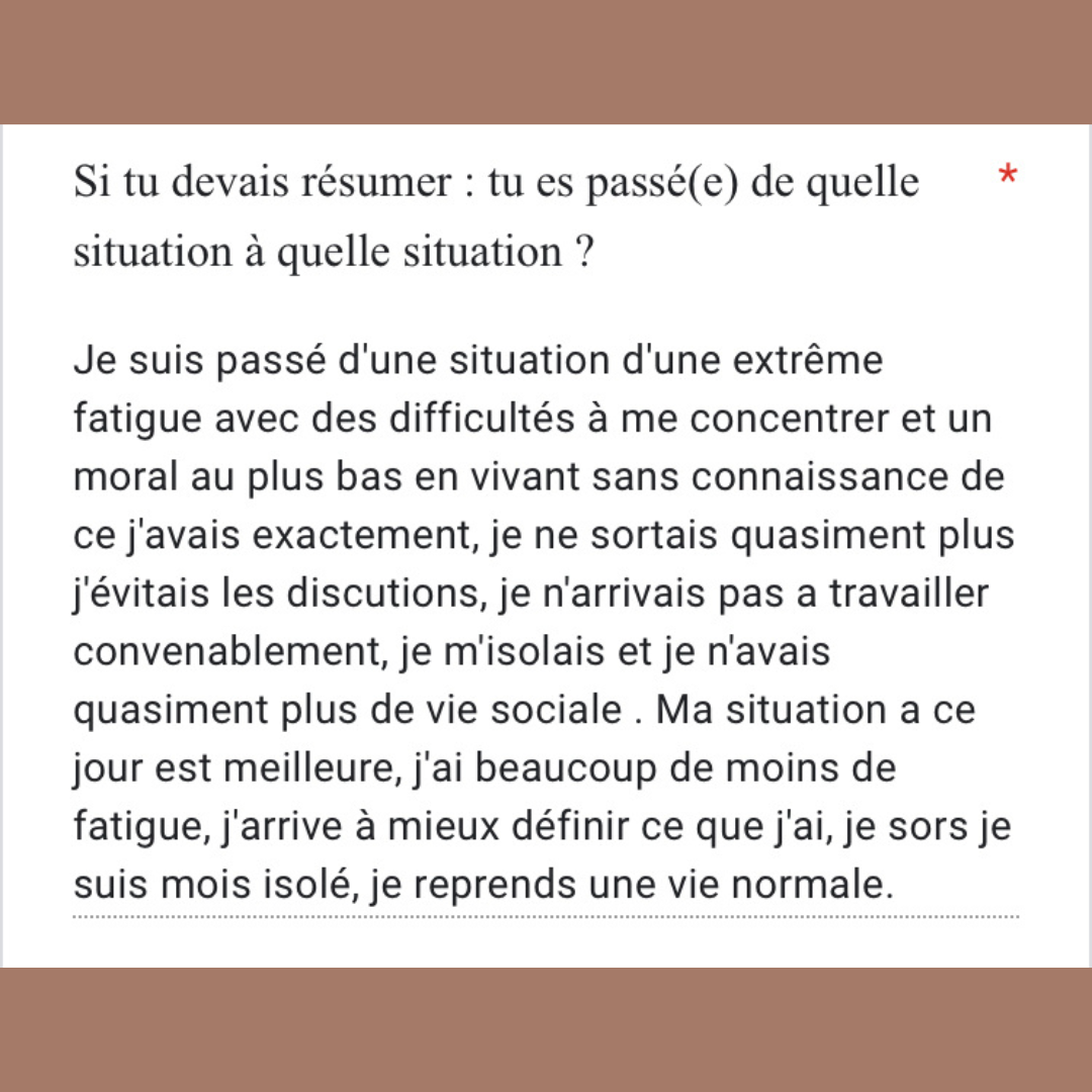 "Je suis fatiguée sans arrêt, je n'arrive pas à me lever le matin, je suis sensible au stress, j'ai des problèmes de digestion, je suis anxieuse et irritable, je me sens parfois dépressive, je n'arrive pas à perdre du poids"